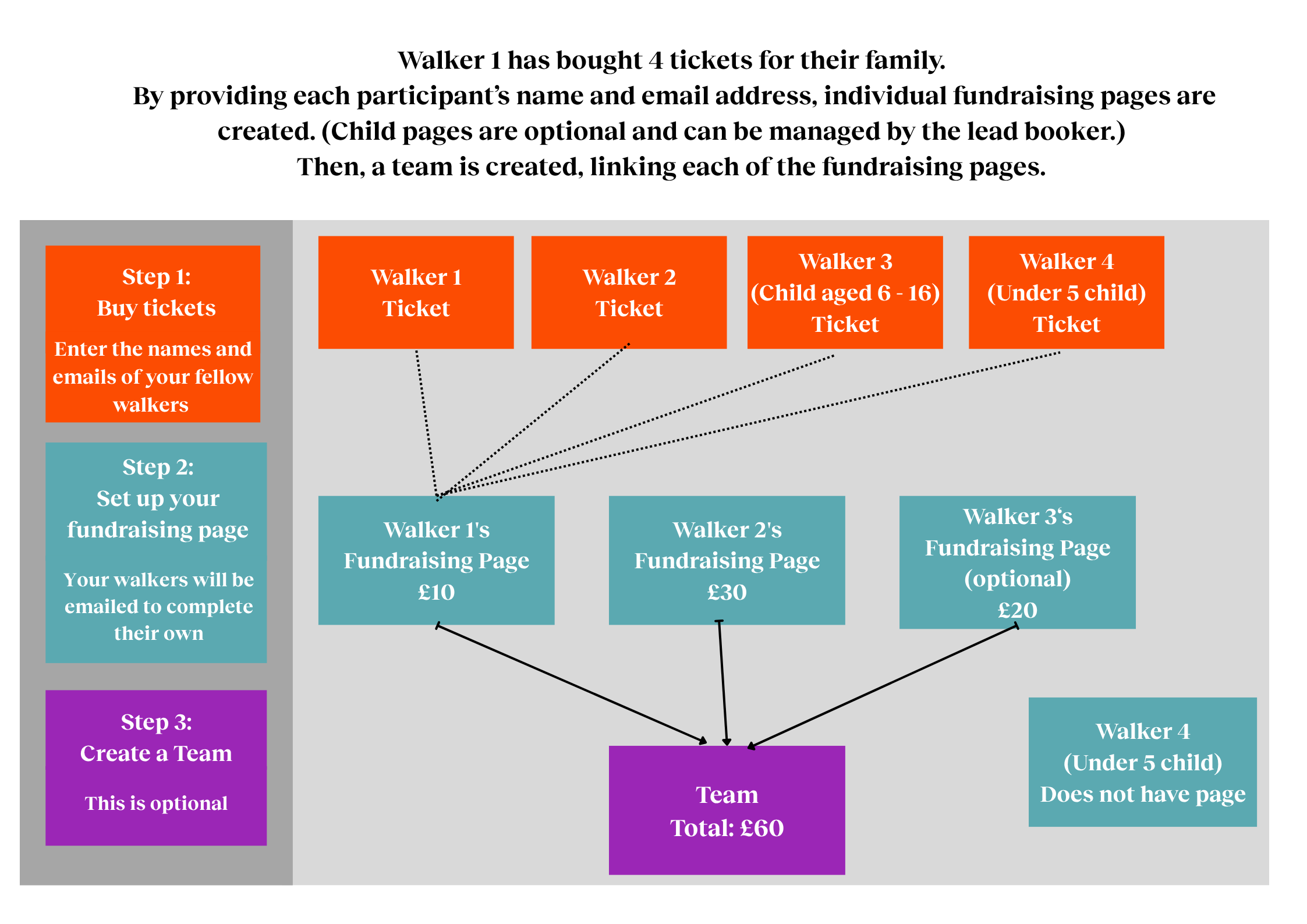 Every ticket holder will be assigned a fundraising page. (This is optional for children)